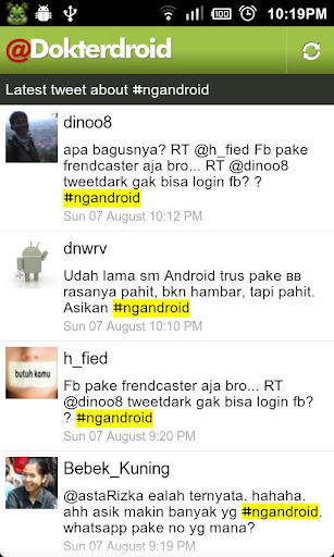 Selain itu, Dokterdroid App juga dapat melihat aktivitas para pengguna Android di twitter dengan bantuan hashtag resmi Dokterdroid, yaitu #ngandroid, #droidlokal, dan #lapakdroid.