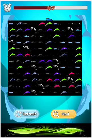 You will see an 10X8 matrix of randomly displayed dolphin icons overlayed on top of a marine background. These dolphin icons are secretly paired up. Your task it discover all the pairs. Just tap on two icons you think are a pair, quickly. Every time you discover a dolphin icon pair, a green line connecting that pair briefly shows and then that pair disappears from the matrix. Your goal is to make all dolphin icons disappear before the end of the round you are playing in.