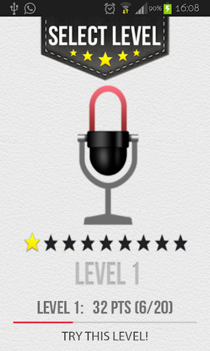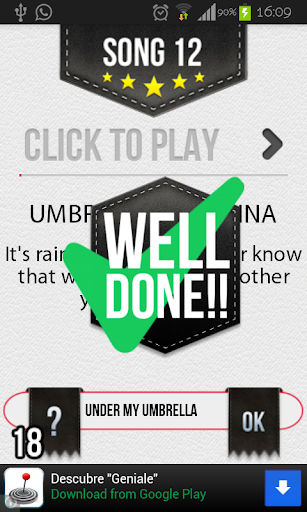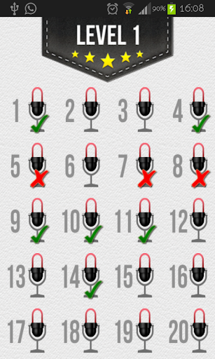 To pass the level you'll have to guess 12 out of the 20 songs of each level. You will be able to ask for a hint to the application, but it will cost you 5 points.