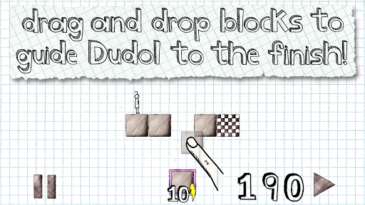 In Doodle Adventures, you won't control Dudol: you control the level! Drag blocks and stuff with your finger on the scene to help your little friend to reach the end, avoiding obstacles and threats. You can use everything to reach the goal, even enemies itself! By going on, you'll encounter trickier and trickier levels, with more and more game mechanics, so get ready!