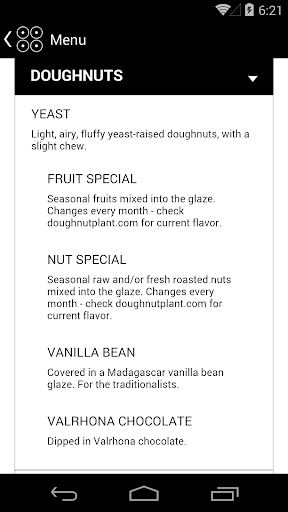 The official Doughnut Plant loyalty app! We make doughnuts by hand with the highest quality, all natural ingredients. Our new app lets you pay securely with your phone and earn rewards along the way. You can also browse our current menu and find our nearest locations. Celebrating 20 years! 1994-2014.