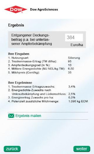 Die Ampfer-App berechnet in Euro/ha den jährlich entgangenen Deckungsbeitrag einer notwendigen, aber unterlassenen Ampferbekämpfung. Sie erhalten diesen in 5 Schritten nach Eingabe der Nutzungsart, des Jahres-Trockenmasse-Ertrages der Fläche, des Ampferdeckungsgrades, der mittleren Energiedichte der Graskomponente im erntefrischen Zustand und des aktuellen Milchpreises.