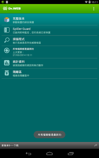 此版本不包括重要元件,如:防垃圾郵件、防盜、防火墻和 Cloud Checker。 使用 Dr.Web for Android(全面保護)保護您的移動裝置,使其免受所有類型之惡意軟體的威脅。