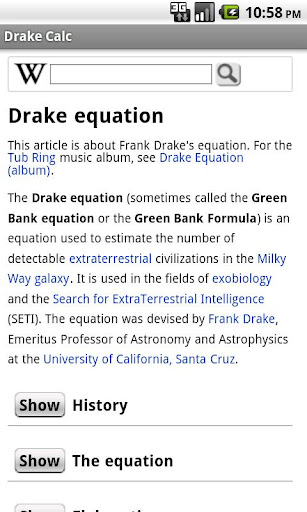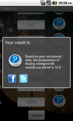 Drake Calculator is a small experiment to estimate the number of detectable extraterrestrial civilizations in the Milky Way galaxy. In 1960, Frank Drake conducted the first search for radio signals from extraterrestrial civilizations at the National Radio Astronomy Observatory in Green Bank, West Virginia. Soon thereafter, the National Academy of Sciences asked Drake to convene a meeting on detecting extraterrestrial intelligence. The equation was proposed there. For more information, check the Wikipedia website (http://en.wikipedia.org/wiki/Drake_equation).