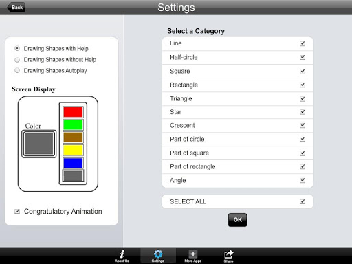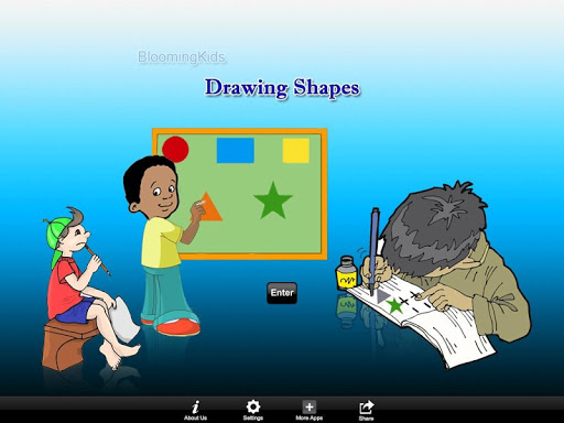 BloomingKids Drawing Shapes -- This program helps the student to learn to draw different shapes. This program can be used with a finger or a stylus. The program allows the child to select color, congratulatory animation, and with a guiding arrow for help or without help or Autoplay which lets the student watch as the apps draw the shape.