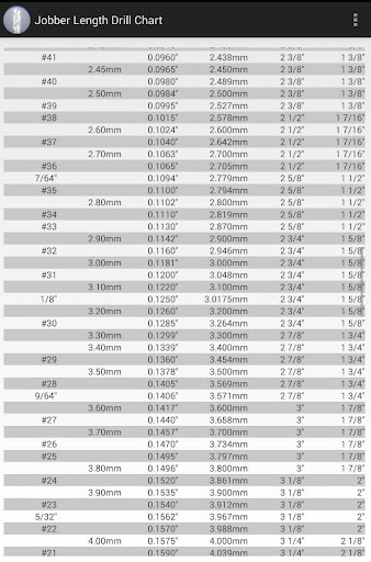Chart showing US and Metric drill bits, their decimal diameter in inches and mm, the overall length of a standard Jobber Bit, and the flute length of a Jobber bit. This app requires no permissions.