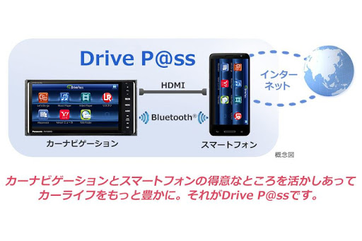 「Drive P@ss」は、インストールしたAndroidスマートフォンと「Drive P@ss」対応のカーナビを接続することで、