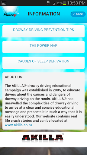 This FREE drowsy driving educational app tells you what you should do to stay alive and to get home safely if you become drowsy while driving your vehicle. A useful 15 minute PowernAP timer is included.This app could save your life ! Everyone should get this app.