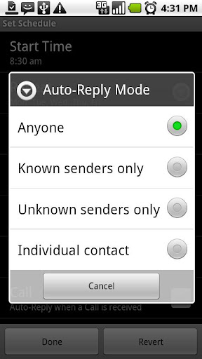 This auto responder app allows you autoreply via sms to any incoming calls or sms during a specified time range that you schedule.