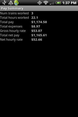 Droid Tally is a time book designed for railroad employees. It can keep track of your trips, times, expense & pay information. It can give you break downs on your pay as well as keep track of all your layoffs.