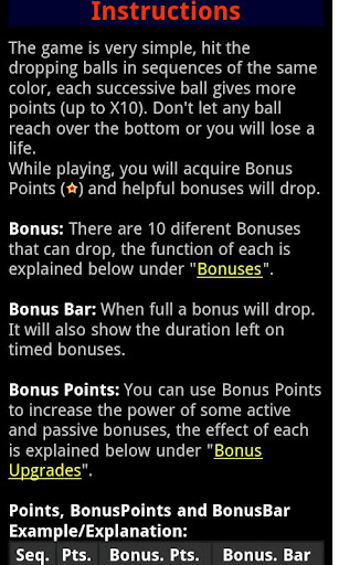 Perform sequences of the same color without letting any ball go over the bottom. Drop Bonuses and acquire Bonus Points to spend on upgrades.
