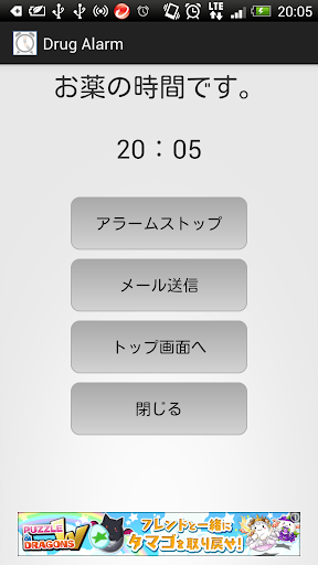 3:服用時間になると、画面が表示されますので、メールを送信したい場合には、メール送信ボタンを押します。2で登録しておいた内容の画面が開きます。送信ボタンを押すと、端末のメールアプリが起動します。