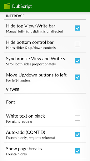 Create a new script in the fast, free-flowing editor... then type away! DubScript uses Fountain markup, so don't bother manually indenting or waste time assigning what's a character or action or a slug line. Just write. It's all simple plain-text, allowing your creativity to flow uninterrupted.