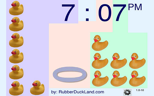 Ducky themed clock helps children learn to count by presenting the time as groupings of toy ducks.