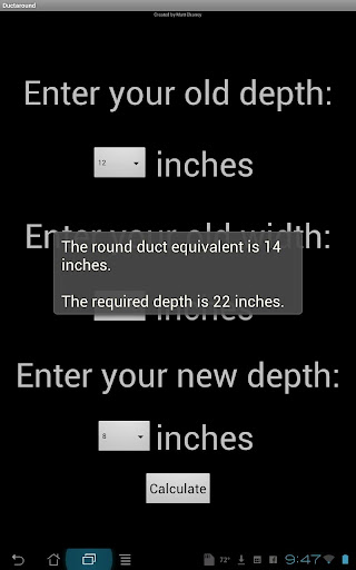 This app is designed for people who work in HVAC (heating and air conditioning). The app is intended to be an Android-based alternate to a Ductulator. DuctAround will calculate round-duct equivalent as well as provide the user with a width required to have the same round-duct equivalent.