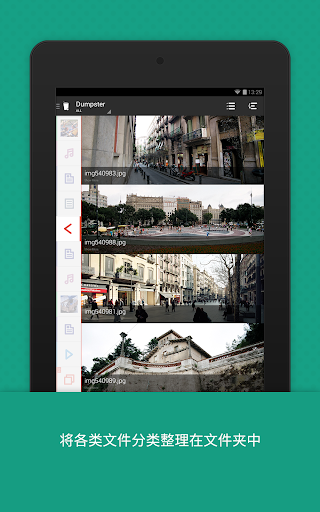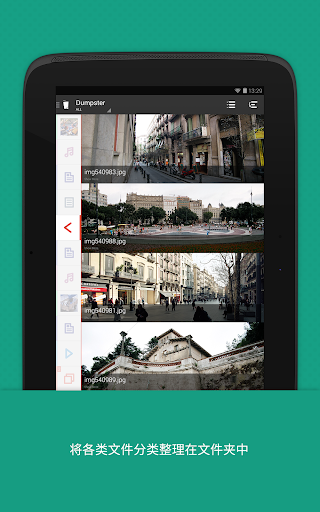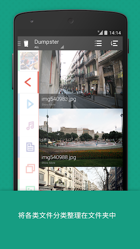 ✔ 使用“分享”或者“发送至”按钮从任意文件管理器或者图片库应用中将文件转移至Dumpster。