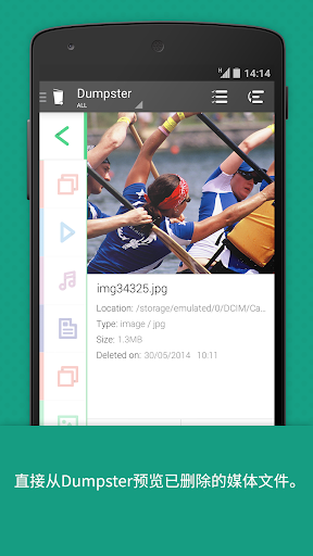 ✔ 恢复已删除的图片,音乐文件,视频以及几乎其他所有的文件类型(pdf, mp3, doc, avi, mp4, jpg, png, rar, ogg, txt 以及更多: http://dumpsterapp.mobi/support.html#file-types)