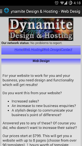 App displays information about our services for new customers, and to webmail and zPanel for existing. Plus quick access to our Facebook and Twitter pages.