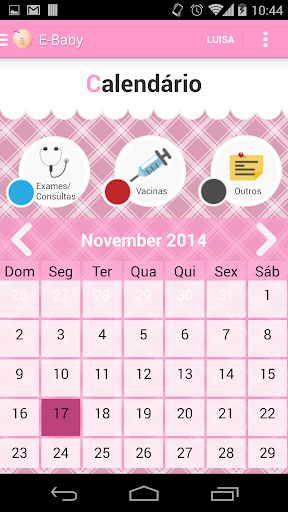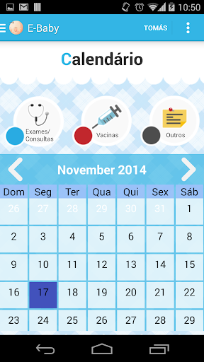 Calendário: Aqui serão cadastrados todos os eventos da criança, como consultas/exames, vacinas e outros eventos que os pais não querem perder, como festinhas e horário do programa favorito do seu filho. Todos os eventos criados podem ser editados e atualizados no calendário e visualizados em forma de lista. E todos os eventos são automaticamente sincronizados com o calendário do celular, por isso os pais serão sempre alertados quando o evento se aproximar.
