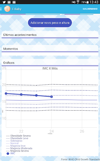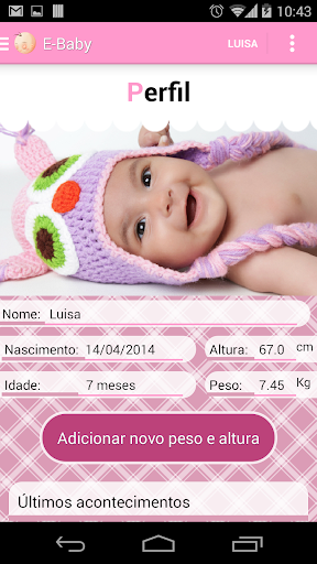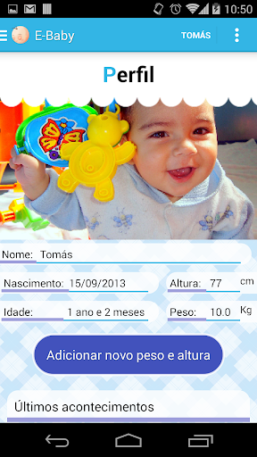 Perfil: Informações básicas da criança, como foto, os últimos acontecimentos, os próximos eventos e o gráfico de acompanhamento de crescimento, onde os pais poderão inserir o peso e altura da criança e conferir se está crescendo adequadamente.
