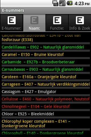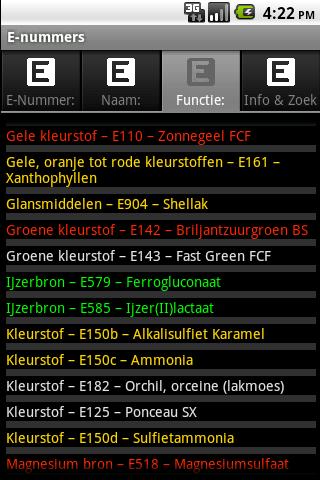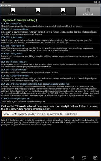 De APP bevat tabbladen met lijsten waarbij alle E-nummers, samen met hun naam en functie worden getoond. Eén met eerst alle nummers op volgorde, dan op volgorde van naam en tenslotte een op volgorde van functie.