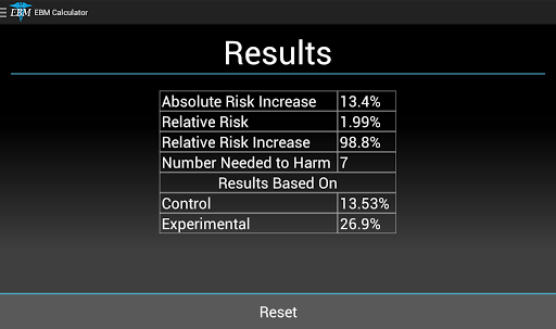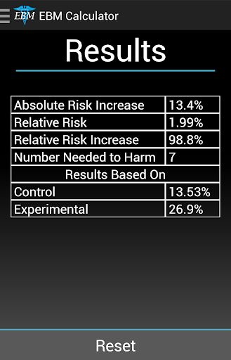 The Evidence Based Medicine (EBM) Calculator provides a simple, easy-to-use tool enabling clinicians to rapidly perform statistical calculations. Due to its sleek and intuitive design, absolute and relative risk differences, as well as, epidemiological measurements including Number Needed to Treat (NNT) or Number Needed to Harm (NNH) can be calculated in a matter of seconds.