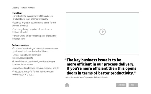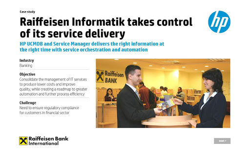 A Customer Reference story highlighting the need to increase efficiency in process delivery for Raiffeisen Informatik. This was achieved by consolidating the management of IT services to produce lower costs and improve quality, whilst creating a roadmap to greater automation and further process efficiency. R-IT worked with HP Software within the framework of the HP Service and Portfolio Management solution. It was critical to ensure regulatory compliance for customers in the financial sector within the solution implementation