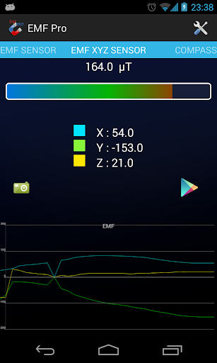 EMF detector Compass Pro comes with all exiting features for measuring EMF and having a compass. Camera mode is available for both EMF and Compass. This application is used to detect Electromagnetic field[ EMF Detector]. This can also be used as an metal detector. This application uses the magnetic sensor inbuilt in the application. It displays EMF is Micro Tesla . Shows a graph and X Y Z vectors. So use this EMF Sensor / EMF Detector .