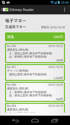 電子マネーカード・モバイルFeliCaからの電子マネーの残高・利用履歴を読み取るアプリです。