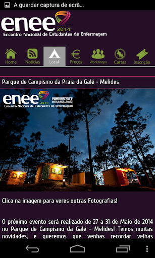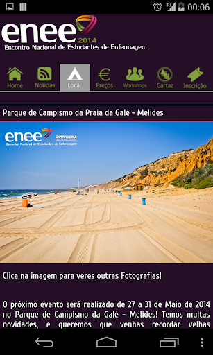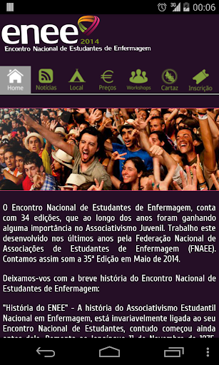 A Aplicação Móvel do Encontro Nacional de Estudantes de Enfermagem é uma novidade no Mundo das APP para dispositivos móveis. Esta conta com a informação mais importante do evento, e numa primeira versão será apenas informativa. Estamos a trabalhar para que em um Futuro Próximo a aplicação seja mais interactiva e te permita estar em contacto com o Mundo ENEE durante o ano inteiro.
