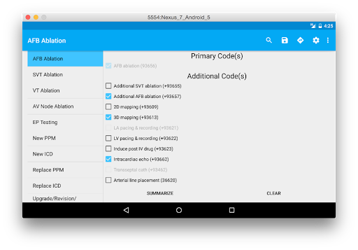 document and bill their procedures by selecting proper CPT® codes, based on the latest coding guidelines. The app is not for professional coders and only includes codes relevant to EP doctors. It is useful for those physicians who need to enter procedure codes directly into computerized Electronic Health Record systems or who just need to communicate to their coders what they have done. The rules for entering codes are complex, and the codes themselves are not mnemonic, hence this app. This app currently uses the 2015 codes, and will be updated as coding changes. We are not liable for any errors in coding that might occur from using this app.