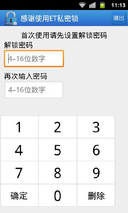 2)拨号键盘输入:数字密码→#→拨出,进入ET私密锁主界面。