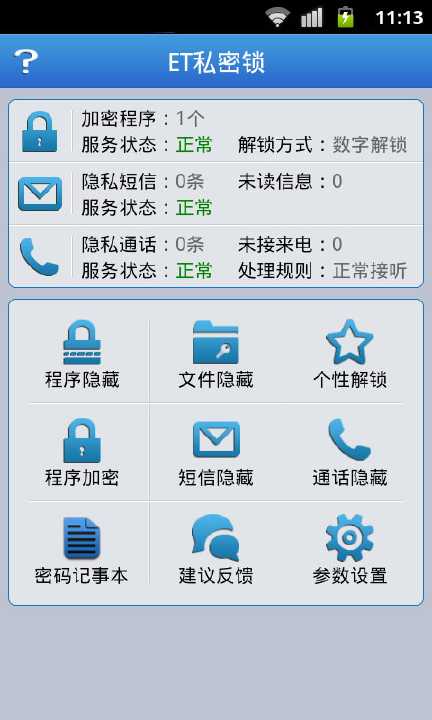 ET私密锁一款针对Android手机上开发程序加密软件,可以对手机上安装的所有软件进行加密,不管是您的名片夹,通讯记录,短信,照片,音乐,多媒体资料,包括第三方软件,游戏,充分做到物归我管,完全加密保护。