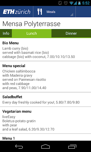 - Catering facilities: daily menus offered by all the canteens in ETH buildings