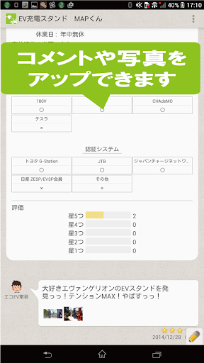 ◎コメント、カメラ機能を搭載しているので、利用した時の状況をコメントしたり、EVスタンドの場所を写真でUPしたりして