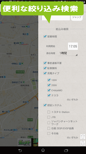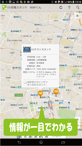 MAP上の『EVピン』をタップすると、充電タイプや営業時間、認証システムなど