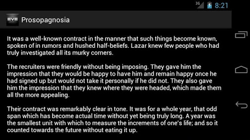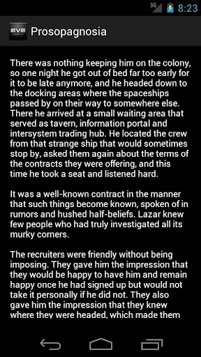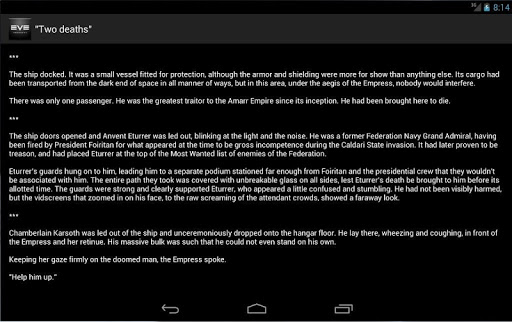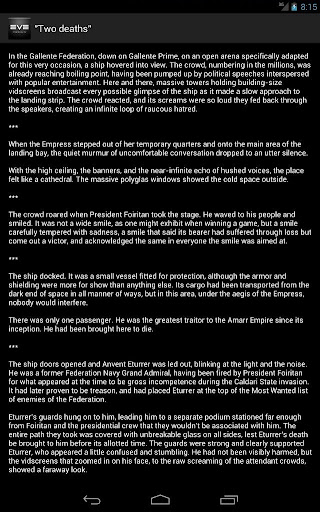 This app will let you have at your disposal all the EVE Online Chronicles published on their site, offline, so you can have a good read in your car, tram, bus, train, plane, or when/if you cannot connect to the internet. If you like this app, rate it. If you have any suggestions, please email me or leave them in the comments. You can support the development of the app by making an ingame ISK donation to Tarsonis Amelana or through paypal.