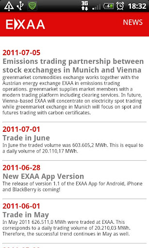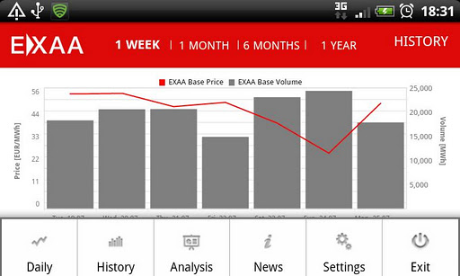 The Exaa Mobile application aims at delivering free and most up-to-date information about (wholesale) electricity prices for all Austrian and German trading areas. The quoted prices correspond to the Exaa Market Clearing Price (MCP) for electricity day-ahead auctions. Besides current and historic prices, the application offers also access to historic comparisons, statistical evaluations of Exaa Analyis and news.