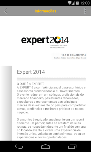 A EXPERT é o maior evento do Brasil para profissionais de investimento. Em 2014, a conferência ocorre nos dias 16, 17 e 18 de maio no Bourbon Atibaia Convention & Spa Resort, em Atibaia (SP). O evento reúne, em um só lugar, profissionais do mercado financeiro, palestrantes renomados, expositores e representantes das principais marcas de investimento do país para compartilhar temas, tendências e melhores práticas da indústria.