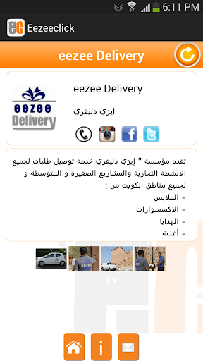 تستطيع من خلال تطبيق eezeeclick الحصول على معلومات عن جميع الأنشطة التجارية و الاجتماعية الكويتية بكل سهولة من خلال تحميل التطبيق على جوالك مجانا، ومن خلال ذلك تستطيع الحصول على أرقام و عناوين و عروض لأشهر المحلات و المطاعم بالإضافة إلى المشاريع الصغيرة الكويتية من خلال التصانيف و البحث السريع