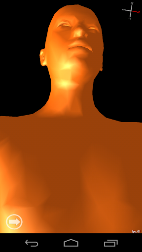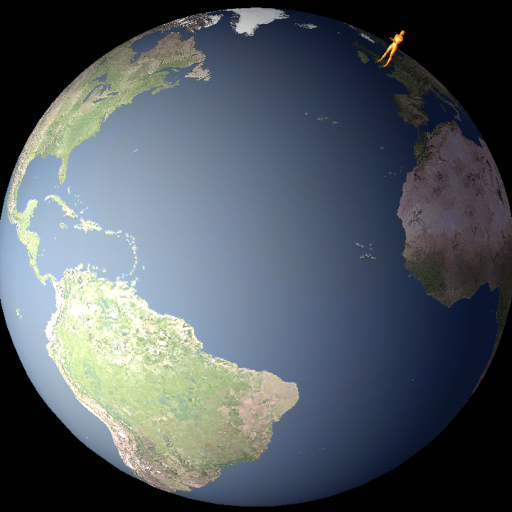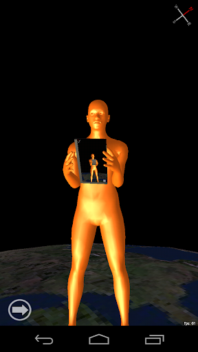 Earthman displays a human model on a virtual Earth at your GPS position and compass bearing. The model holds a phone that mimics the orientation of your real phone and displays what you see on your real phone, i.e. the virtual world. The virtual world can be viewed distant from the human model or from the model's phone. In the latter case the virtual phone acts like a camera in the virtual world, but one that renders its input to both the real and virtual phone screens.
