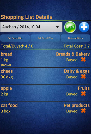 Easy Android Shopping List contains multiple shopping lists, Text to Speec function to say the buyable items (english and hungarian language), editable stores, products categories and units. In addition, other features including last known cheapest price and store suggestion from previous shopping lists, multi language interface, shopping list sending by e-mail.