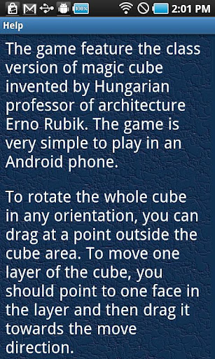 Enjoy playing the classic magic cube with your droid. It is so easy to operate! The game is very simple to play. The whole cube or each layer can be easily rotated to any orientation. A game resumes automatically when the application restarts. The moves are stored using a simple unique notation which helps the user to develop the solution skills.