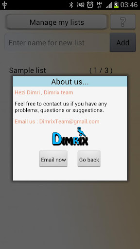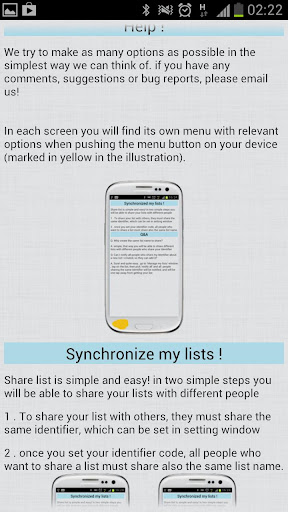 With "Easy Synced List" you can create any list you desire and send your list or receive from other users by our server ,Email or SMS !!!