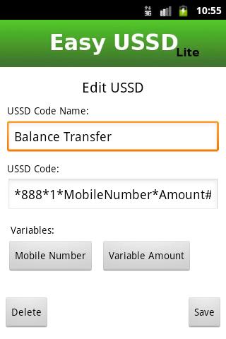 Even if the USSD code has Mobile Number variable or amount variable, you can use the variables butons with the USSD code entry you save. Then you can pick the Mobile Number from your contacts or enter the amount variable when you use your saved USSD entry.