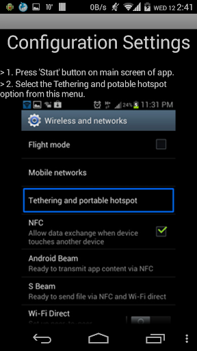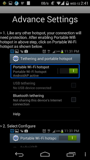 Easy Wifi Hotspot is an app which converts your android device into a virtual wifi router and creates a secure wifi hotspot.(no installation required). Most apps offering wifi hotspot services require 3rd party software installation in your device or monthly subscription fee but our app does not require any software installation or subscription fee. With this app you can directly turn your device into wifi hotspot from settings. You can use this app for lifetime without paying any extra penny.