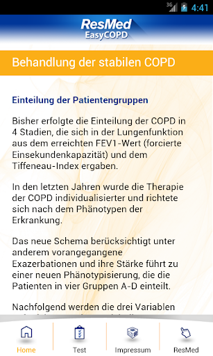 In der App enthalten sind Informationen zur Definition, Diagnostik, Behandlungsmethoden der stabilen COPD, sowie Detailinformationen zu Langzeitsauerstofftherapien und zur Nicht-invasiven Beatmung. Die App enthält auch einen Schnelltest zur Ermittlung der GOLD Klassifikation der COPD.