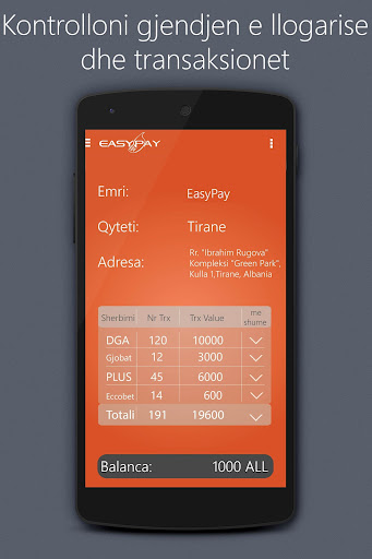 The user can load EasyPay account via Visa Card and then can pay all the services through Android mobile. Fee per water bill or fine payment is only 50 ALL. .There is no fee for the other services. This is the first mobile application that offers a public service payment in the Albanian market.