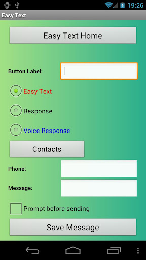EasyText All-In-One is an App that makes sending a response to calls, missed calls or text messages with your own message as simple as the push of a button, and now Voice! For a quick no hassle response EasyText All-In-One can send a predefined text message with the touch of a button, or by simply speaking a response. The number of created messages are only limited by your memory and patience :). You can create messages for any occasion: "In a meeting", "Driving, call you later", or create responses on the go with the voice-to-text feature. Your messages are made sort-able and color coded with 3 types of icons (predefined, respond or voice) so they are easy to find. No ads, just easy. So easy anybody can use it!