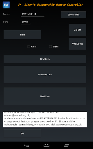There are times when you need to control Easyworship yourself - in schools or in small group worship settings. I wrote this client to interact with my PC-based Server Program which can be downloaded from https://dl.dropboxusercontent.com/u/29488949/EWServer_setup.exe